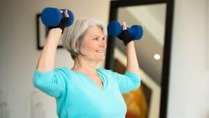 - Usando alguns halteres leves ou produtos enlatados que você tenha em casa, estenda os braços para cima, acima da cabeça (de modo que seus bíceps fiquem próximos às orelhas).